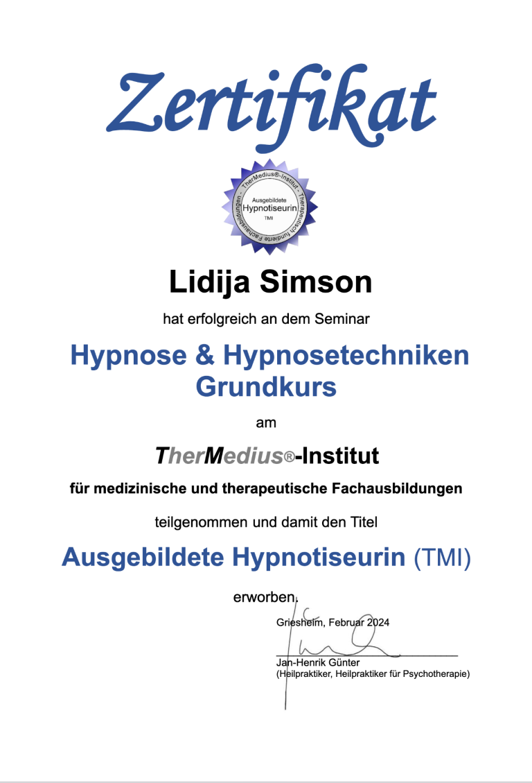 Die Hypnose ist keine medizinische Heilbehandlung und ersetzt weder Arzt noch Heilpraktiker.
